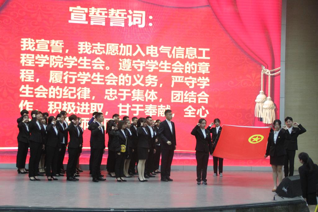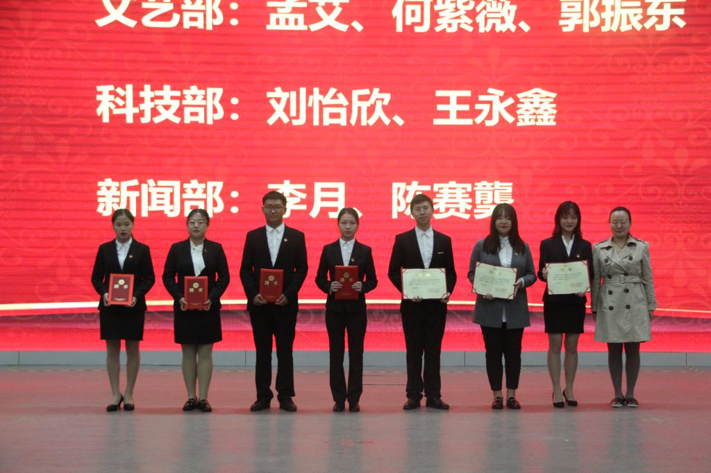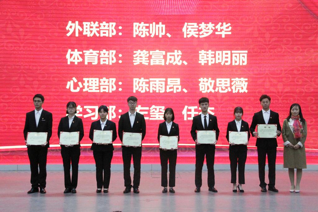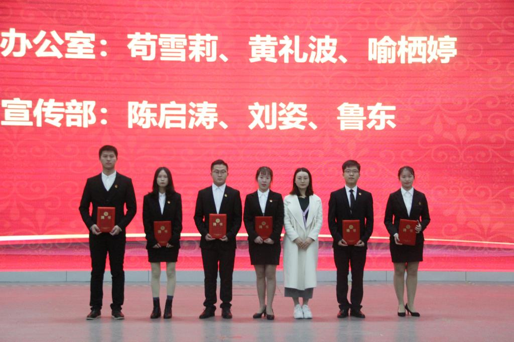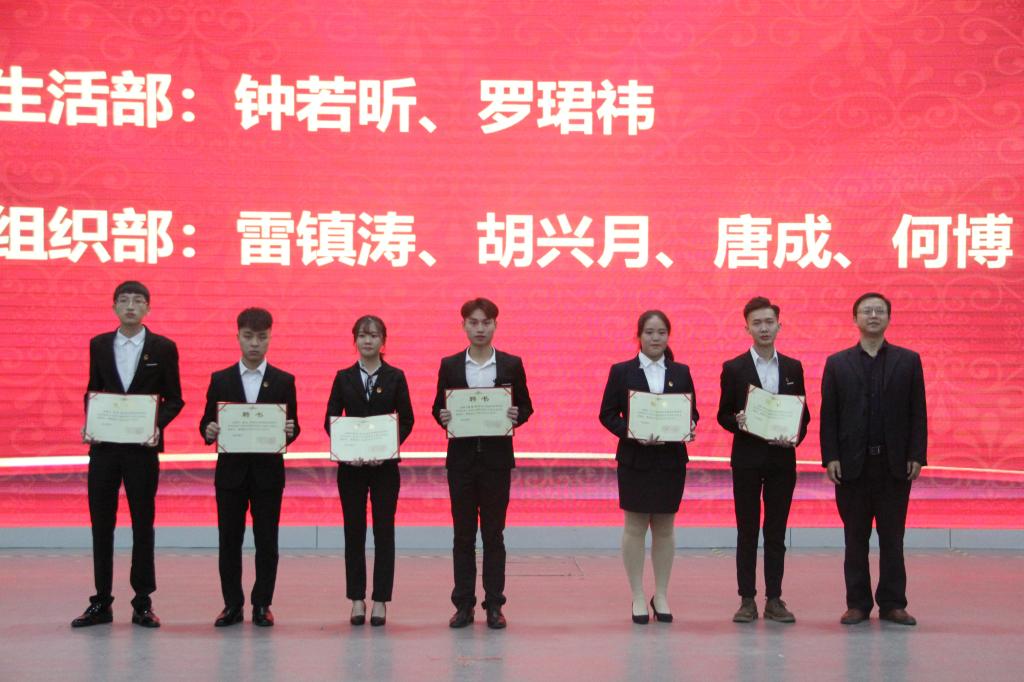 2018届员工会主席杨振宇汇报了2018-2019学年员工会工作情况;团总支书记周瑶老师宣读了2018届干部聘书名单并颁发聘书;2018届员工干部为2019届新任员工干部授予干部牌;2018届员工会主席杨振宇与新任员工会主席唐辛完成团旗交接;周瑶老师带领新一届员工会干部进行就职宣誓;2019届员工会主席唐辛作员工会工作规划报告。